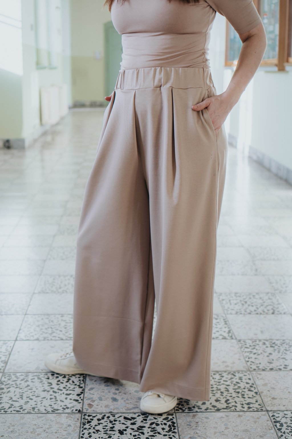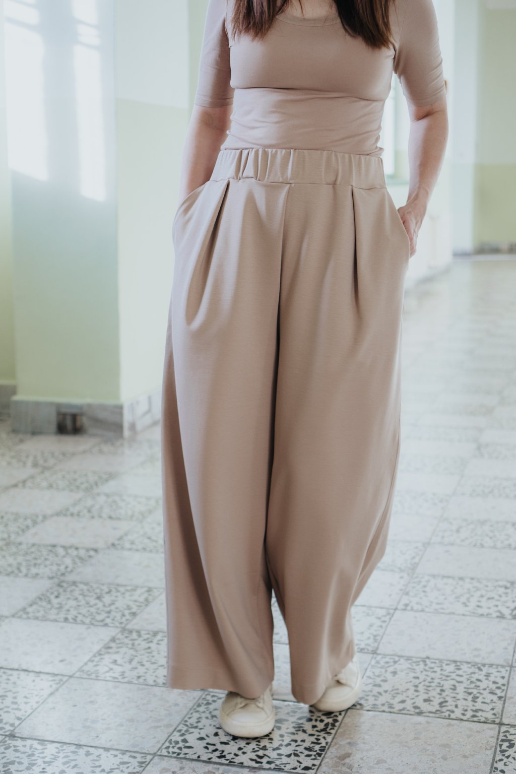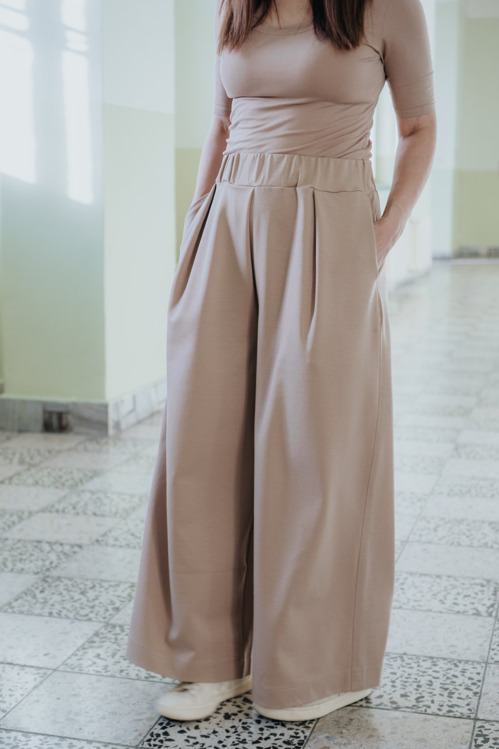 Pallazzo kalhoty Giselle pro milovnice širokých kalhot, které budete zbožňovat a nosit všude, tak jako já. Vycházejí z osvědčeného střihu Estelle, pro který se tak rády vracíte, jen jsou střihově upravené, aby fungovaly i jako dlouhé. Nosí se jako pasové a přes boky jsou volné. Vybrala jsem na ně materiál Tencel Ponte, který je pružný, příjemný, odolný a jednoduchý na údržbu. Maximum pohodlí zaručeno.