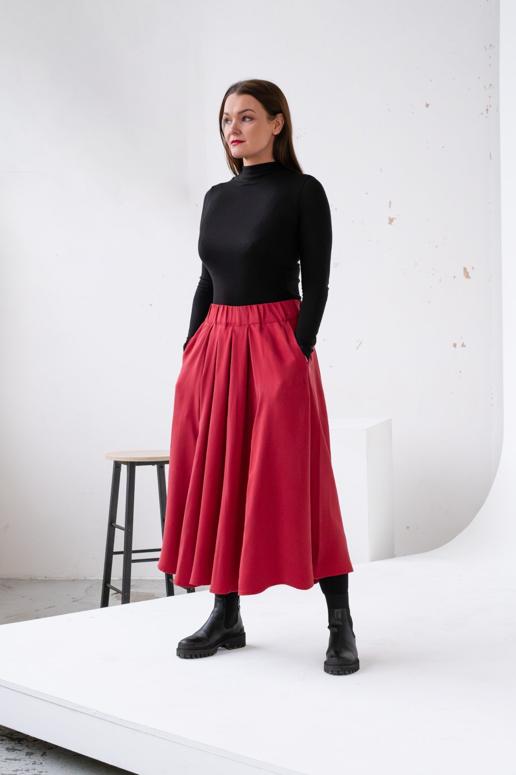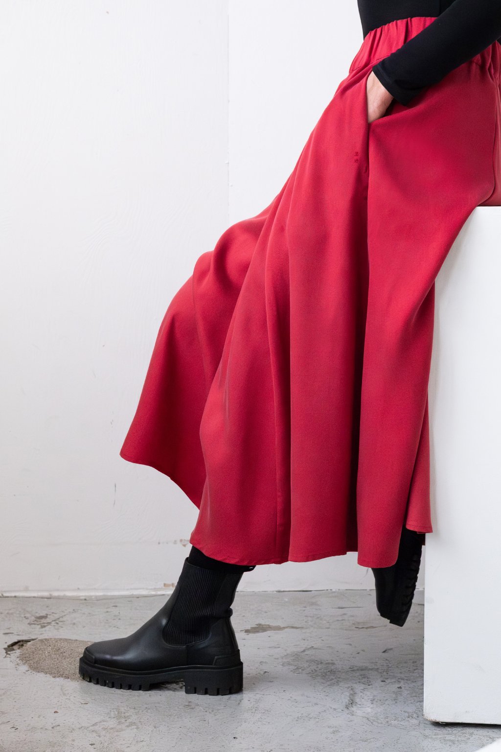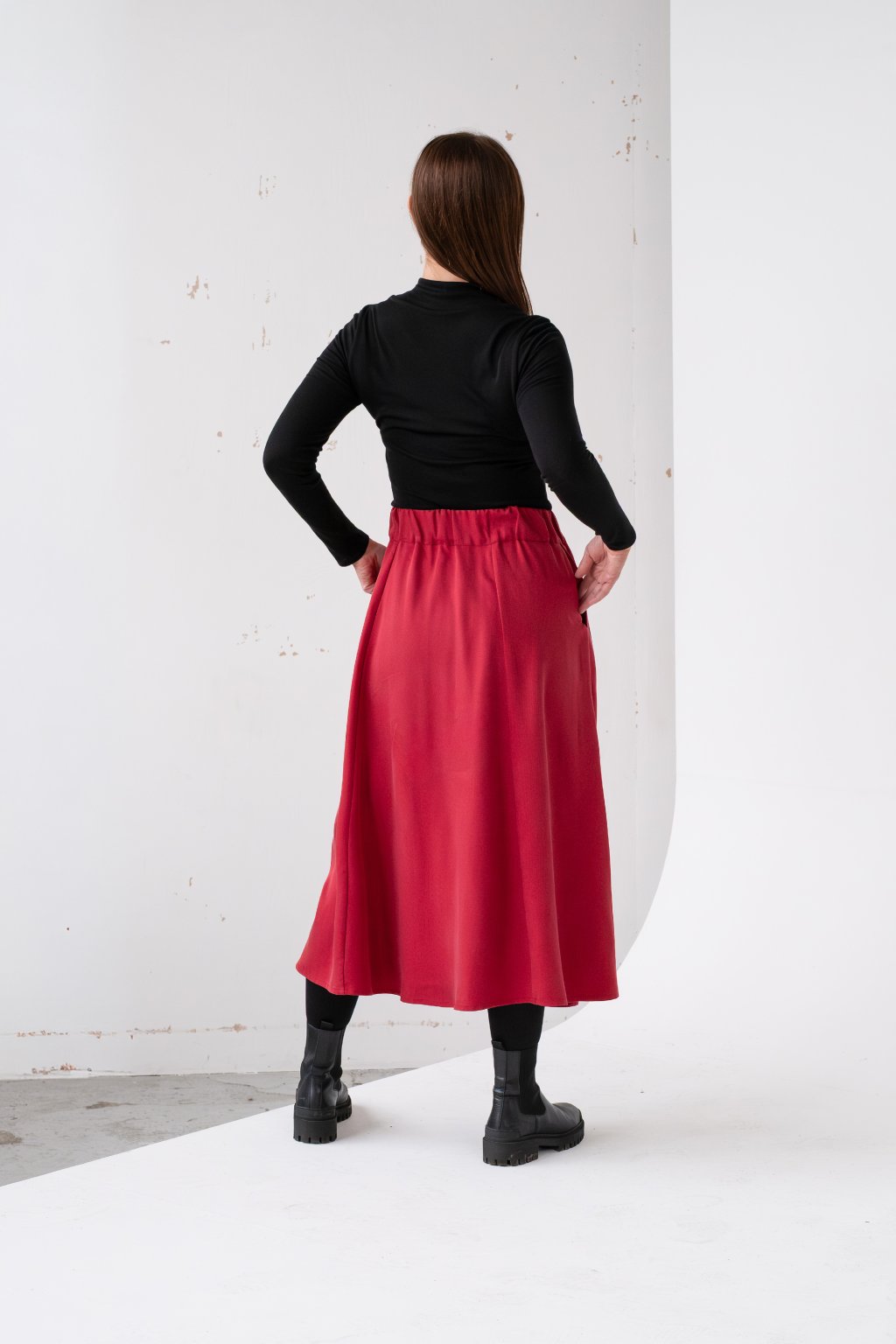 Samozřejmostí jsou hluboké kapsy - bez nich už si ani žádnou sukni neumím představit. V pase má širokou gumu, která je měkká a netlačí. Sukni šijeme z úžasného tencelu. Vybrala jsem ho v té nejlepší kvalitě a ve vysoké gramáži, díky tomu je sukně na dotek jako pohlazení a nebudeš ji chtít ani sundat. To ani naštěstí nemusíš, protože termoregulační vlastnosti tencelu ti umožní ji nosit neomezeně celý rok.